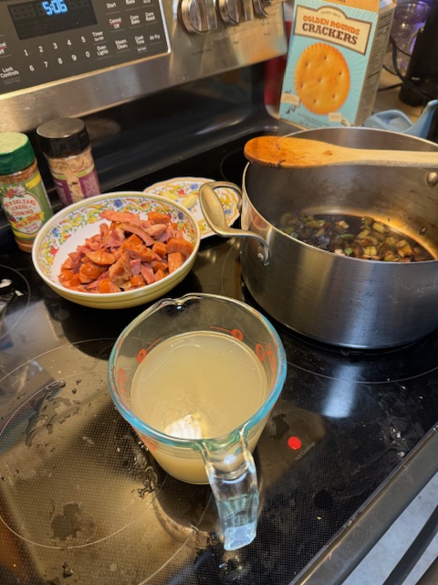 I replaced chicken with ham and smoked sausage with andouille smoked sausage in a large pan with a lid. I cooked the meat while finishing the assembly of the components. I used cane syrup for the brown sugar, which surprisingly added a smoked flavor or, more likely, increased it when I carmelized the sugar after removing the meat. I added the trinity (onion, green pepper, celery) but delayed the pope (sliced garlic) until later. I included not a roux but Kitchen Bouquet sauce from a jar, as I learned in New Orleans (a cheat and an improvement). I cooked this until it almost stuck to the pan. This turned the veggies black, but I had no fear. I returned the meat, added the pope to the pan, and let it all get settled and friendly with each other again. I added a regular-sized can of fire-roasted chopped tomatoes and scrapped the pan bottom to get all the smoke goodness in the sauce. I put in more than a tablespoon of Joe’s spices from the class (Bayou blend) and a tablespoon of their Cajan Worcestershire sauce. I added some of their dried garlic, too. I added two cups of rice I had (Indian style, but no matter) and three and some more cups of chicken broth from a box. I bring it all to a boil, cover, and reduce the heat to a low temperature to match the usual rice cooking process. It was done after twenty minutes.