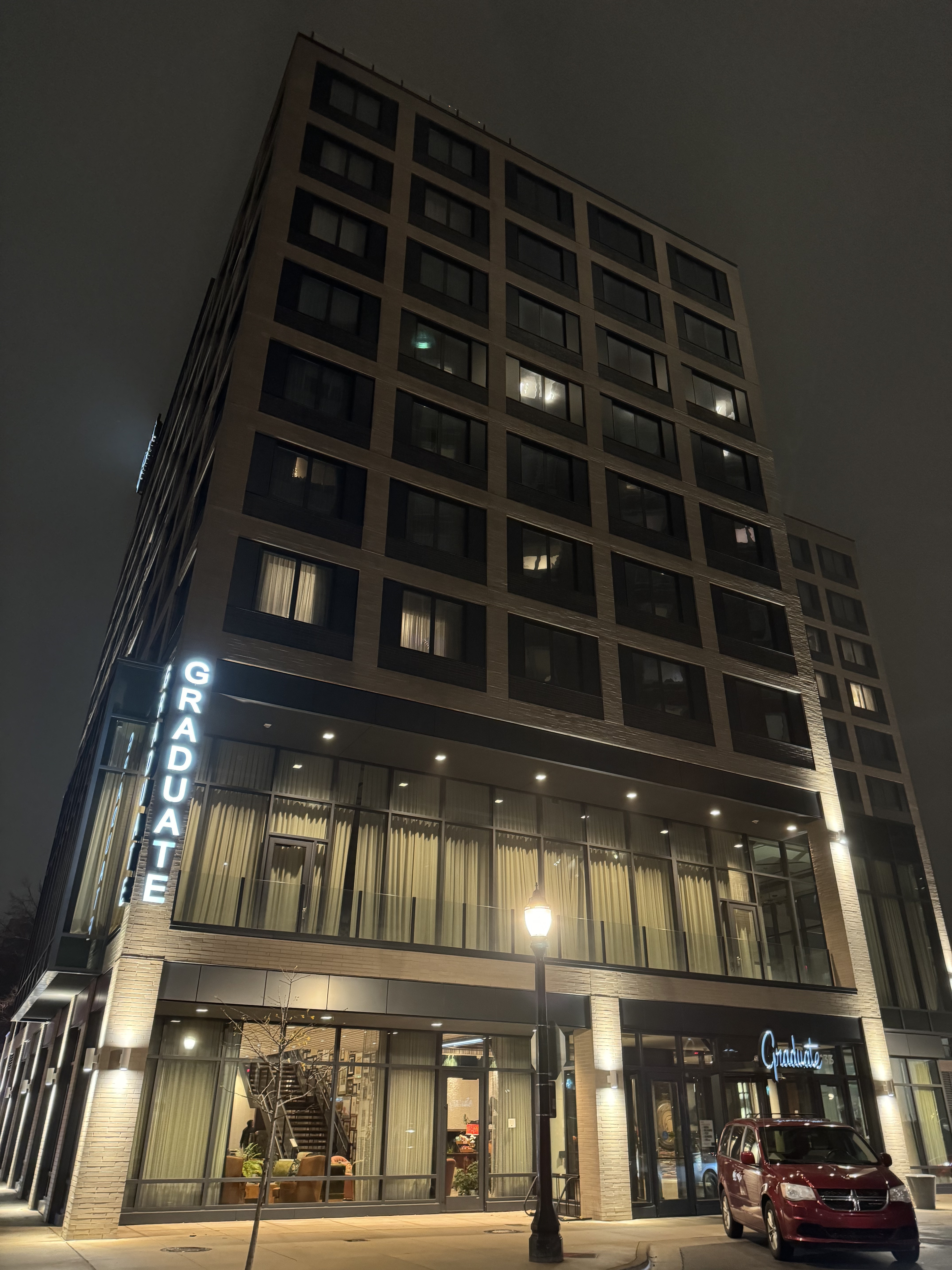 I arrived in East Lansing in just over an hour and found my hotel following my memory and the ApplePlay navigation. I parked in the mess of cars by the hotel, and a valet soon took my keys, name, and SUV. I went to the desk with low expectations, as it was not noon. I was thrilled to learn that my room was ready and that I could head there. Soon, I was unpacked and out of my clothing for the trip, showered, lying down, and luxuriated in my room.