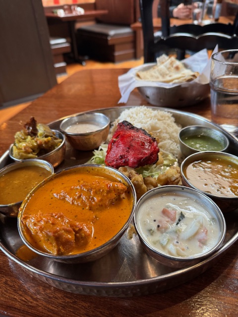 I ordered their lunch special, a large tray of items in small bowls, and a basket of naan. I chose the chicken version because the goat entree, my favorite, often has bones, so it’s risky. I enjoyed the chicken version; my tastes are still off from the thrush and nerve issues from my brain tumor surgery, but the spicy foods worked for me. Excellent.