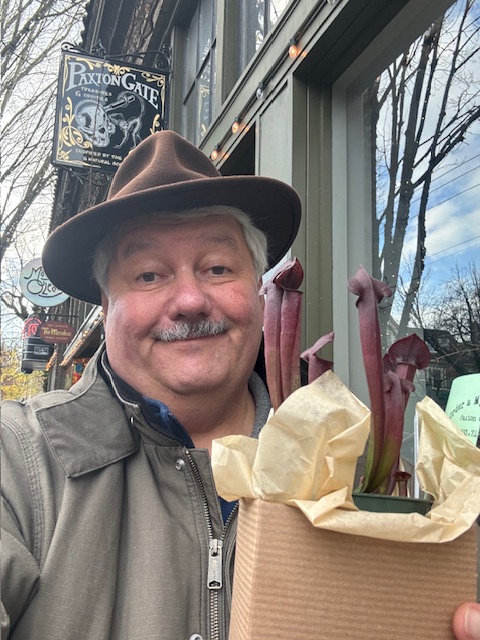 I walked around the area and started shopping. I mostly looked, but I did try the weird Paxton, which specializes in taxidermied items and other dead things, and found something for myself. They had the carnivorous plants for sale and an expert to talk to, who was not surprisingly named Zak. I thought with the trays of orchids and the light, this would be a good match, and Zak agreed and soon picked out, after being directed to the larger pots, a lovely pitcher plant for me (sarracenia). I was instructed that the plant likes distilled water, but it was easy to raise.