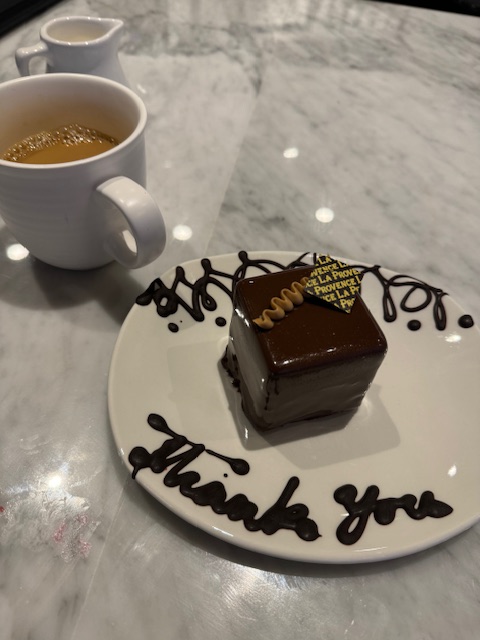 La Provence’s new staff appears, and they even help others who dare to sit at the bar. Chaos recedes as I finish my cake. I soon head to Portland in moderate traffic as it gets dark. I arrive at Richard’s without issue.