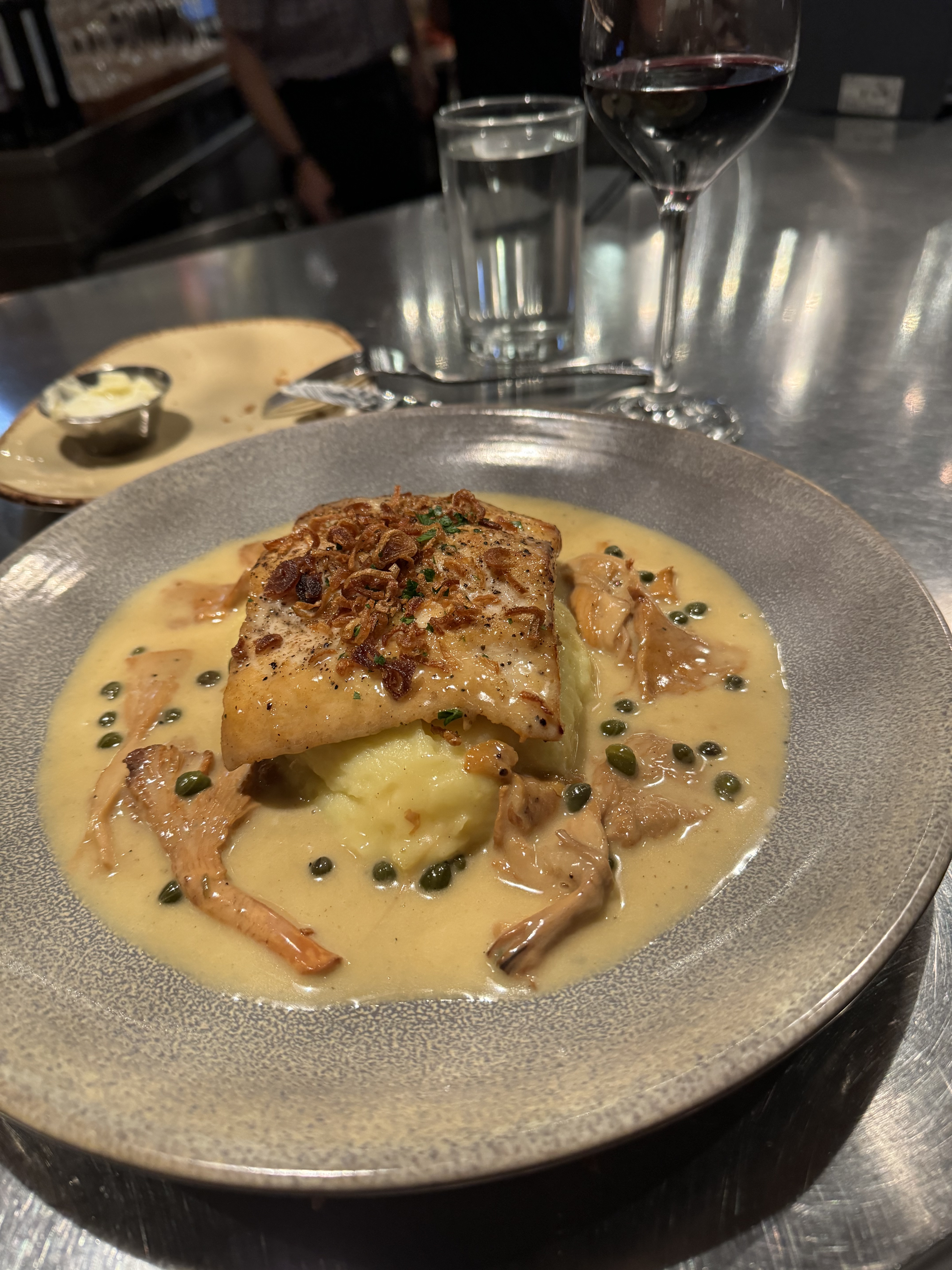 Air Volvo delivered me to Beaver Creek MAX station, and I soon scanned with my phone and paid my fare. The trip was uneventful, and I read most of the time. I entered Portland at the Library stop, which can have some street theater and be risky. I walked up the hill and found that the Southpark SeaFood restaurant’s bar would ruin my money-saving attempts. How can I resist Sturgeon Piccata? That and a good glass of red wine (I don’t drink whites with fish, sorry) with bread and butter as a starter (even free) made for a beautiful meal. I ended with coffee; they took the coffee off the bill to welcome me back. I needed the coffee as I did not want the fine food and wine to cause me to nod off in the music.