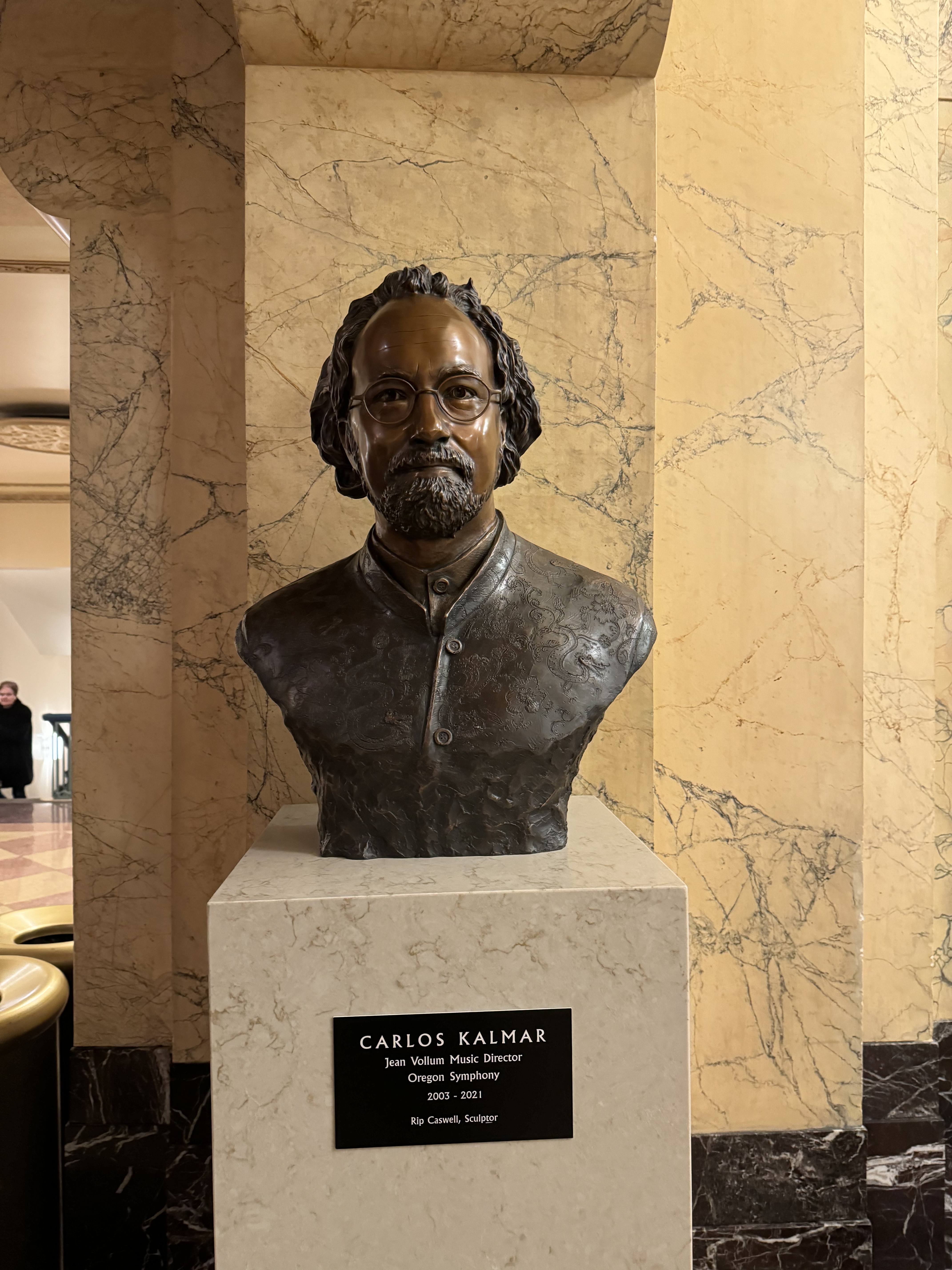 I saw the bust of the previous conductor, Carlos, and I missed him. He retired during the pandemic. Susie and I used to buy him a beer at Southpark after a concert. He was fun and friendly, and his talks before the concert were full of laughter and his love of music. I also missed Jean and Orville, who used to attend the Oregon Symphony on Monday nights. Tonight, I remembered all the fun I had with music and Susie, Jean, Orville, and Carlos.