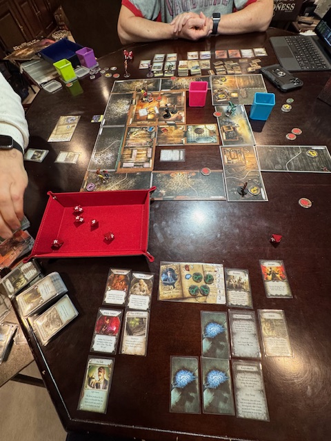 While I enjoyed the game more this time—I am more familiar with it now—I did not know that the other players would win alone. Still, it was more immersive this time, though Richard was trying to power through to reach the final objective. We all took more damage in this game, and I felt my fellow players were less cooperative and trying to win. It is always interesting to play RPGs with hard-core gamers, which is more board game games than RPGs. They seek to win, not tell a story.