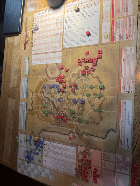 We were now five hours in. We were about 2/3 through the first month! There are five months. Michael R and I talked about history and how history records the same events while having a delicious meal served by Natalia. I was on a second beer as I celebrated the Roman successes.