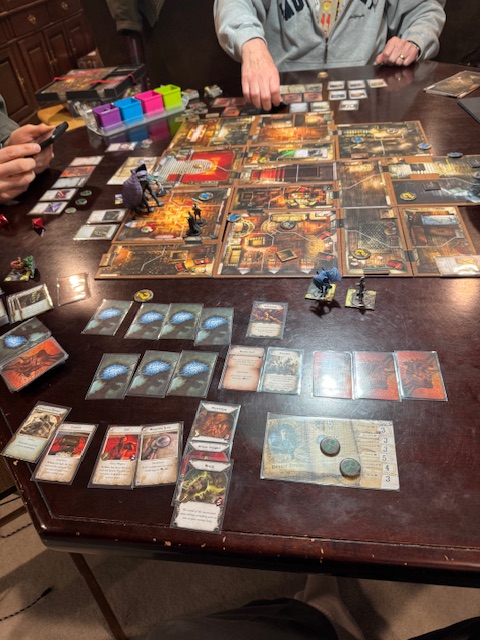 I arrived at Richards in northern Portland five minutes late. James and Richard are still setting up. We are again playing a scenario in the older Mansions of Madness, Second Edition board game. This is one of the role-playing games (RPG) styled board games and uses an app to avoid assigning one player the keeper’s role. I still find it slow, and board gamers want to win; it is their nature, and they have some trouble with cooperative games. But still, it is interesting, and the Lovecraft theme is my favorite. This play, the third scenario, is more complex, and the story fits the theme better.