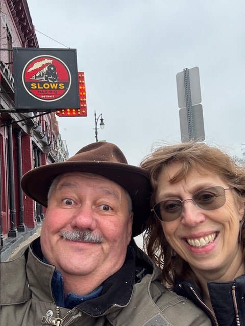 Next, we needed food, and Deborah and I decided on a place, Slows Bar-B-Q, on the way to John K. King Used and Rare Books’ main store. We found parking and realized that we were at the renovated Train Station. Something we had on the list to see, but we headed to food. We crossed the four-lane road to get to the place. The main door is somewhat hidden, with signs on the wrong door that says, “This is not Slows Bar-B-Q.” I spotted a door made of reused floorwood that matched the facade, and that was it. We wait for a seat at the bar, and soon, a group leaves, and we take a seat.