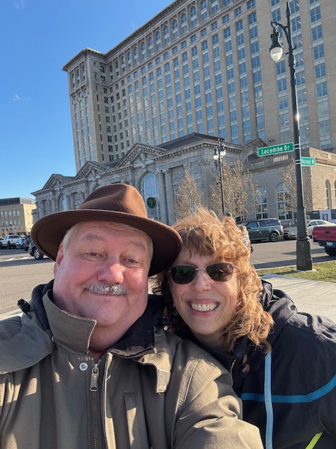 Parking was a challenge, and we did a few loops. We finally parked within sight of the Michigan Central Train Station (MC) in a space that Deborah backed into. Air Mini fits well in the extra-large slot. We walked a few blocks through an impromptu sidewalk soup kitchen with items to buy, still being set up (it was gone when we returned). I tipped my hat to the various folks, and that got smiles. Most people want to be seen.