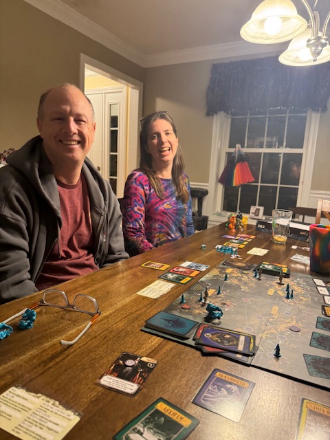 Before this, I played Pandemic Cthulhu with Clint and a second game (Clint and I lost the first one) with Clint and Hope. This is a re-themed version of the cooperative game Pandemic but with mechanisms that hammer the player characters and exotic artifacts from the Lovecraft Mythos. Hope reminded us of a few options, and together, we managed to close the gates in time and save the world (for now). It is a fun and challenging version, and I have a copy (all the figures painted). It plays well for any player count (there is no solo version).