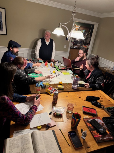 We played with eight players, all pre-made characters at seventh level for 5E. I downloaded them from D&D Beyond, and Clint printed them out. From what I saw, all the premade characters were powerful and legal. They did include items from various exotic books, but they were still, I believe, legal for the regular 5E version of Dungeons and Dragons, with all the basic magic items supplied to make the character playable. All the numbers and special rules for the character were printed on the sheets. All ready-to-play versions.