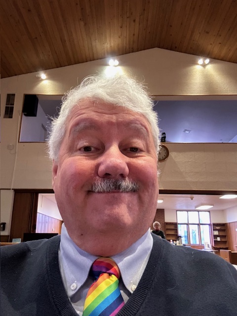 While Deborah returned to crunching data, I finished and published a blog about Saturday, cleaned up, shaved, and dressed for church. I switched to grey slacks, a gray dress shirt, a Pride tie, and a blue sweater vest, my new look for church (my suits are now quite big on me). I found my black shoes, Cole Hann’s, and black socks but wore my usual wool brown hat.