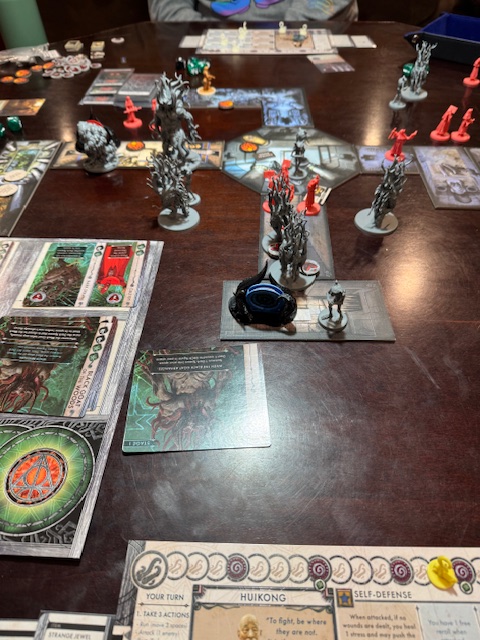 I traveled to Richards. One player is a no-show; it happens. We changed to a better three-person setting and a cooperative newish game, Cthulhu Death May Die. I have not played it before, but it flows better than Mansions of Madness, Second Edition, a game with a like theme, and it seems to grant more agency to the players. But, my options are mostly to attack and fight, not matching the theme at all (Lovecraftian stories and games are about discovering a horror, running, and solving a problem), and it appears to be a reworking of a SciFi game.