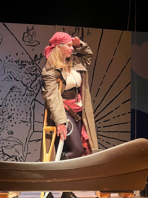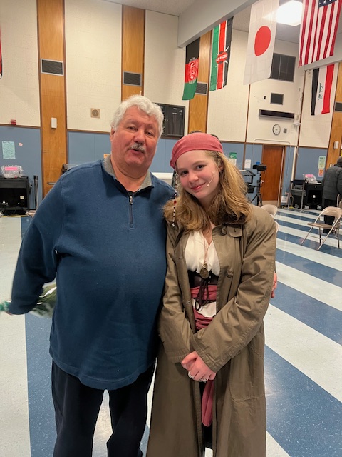 I arrived at Z’s school, which was near her home. I brought flowers from Home Depot, and we enjoyed the middle school play version of Treasure Island. Z steals the show as Long John Silvers on Z’s crutch and one leg folded back. Unlike some other kids, Z’s mic is taped properly to Z’s face and picks up Z’s clear voicing. It was a fun play with some singing led by Z (“Fifteen men on a dead man’s chest” and so on).