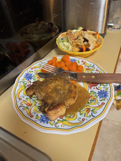Before this, with Deborah on the phone to chat, I made a nice dinner for one, though I will likely repeat this for two in a few weeks for Deborah’s visit. I steamed carrots that I sliced and peeled. I made a salad with carrot peels, pickled beats, croutons, and Italian-style dressing. The center of the meal is a 1″ thick pork chop (smaller than the massive ones at BJ’s Brewhouse but big enough). I sprinkle it with Herbs de Provence and ground sea salt. I heated a mix of olive oil and butter (to keep the smoking down) and fried it in a metal pan that could go in the oven. I got two sides showing some brown and then put it all in the oven at 350F for 8 minutes.