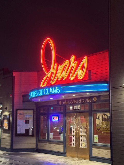 We knew they had a strange locked door policy for their lobby, and soon, the clerk let us in. Deborah got to our room, and Dondrea and Z were quickly checked into their room. After getting our rooms in order, we returned to the lobby and decided to consider Ivar’s Acres of Clams on Pier 54 for dinner. But we are in the hills and must find a way down to the pier. We walk and spot a staircase. Neither Dondrea nor I remember stairs being here (we think they are new) and were happy to see them lead down to the piers by the Ferris wheel.