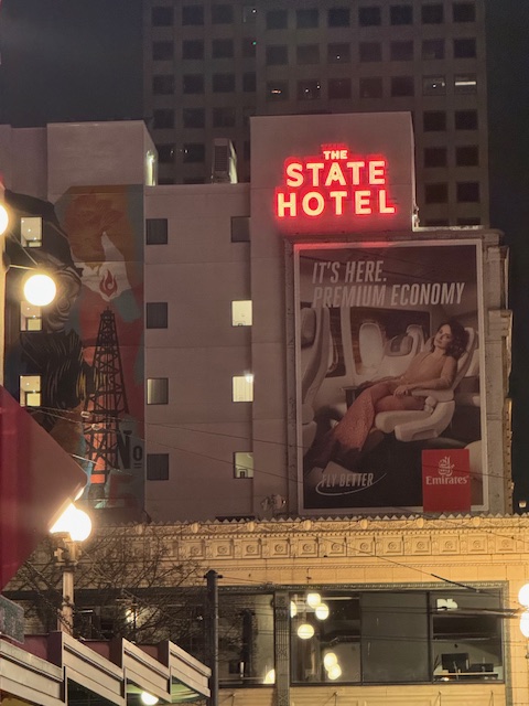 Next, we returned by stairs to our hotel using the stairs, this time through the Pike Street Market, and walked a few blocks to learn again where everything was. We then had to climb up one hill that was quite steep. I was not ready for that. Dondrea provided me with some painkillers as I had bruised my foot. I had pressed down on it while at dinner and on the train, a bad habit. Once we reached the lobby of The State Hotel (now able to open the doors with our room keys), we sat and chatted for a while. It was early, but soon, we said our good nights.