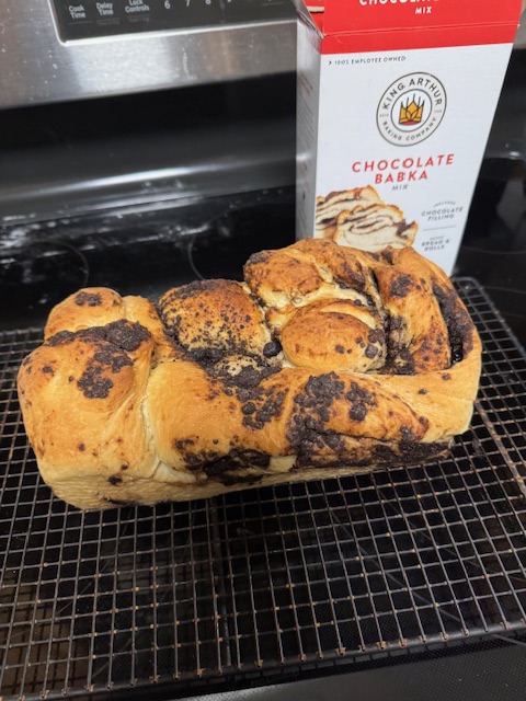 I returned home, made babka bread from a mix, used my bread machine to mix and rise the dough, assembled it, and let it rise again. I almost threw it unrisen into the oven, skipping a step, but saw the error, dumped the bread, making it a bit messier, into a cold pan after I retrieved it (yes, I did put it in the oven first and then releasized I was out of sequence–sequence is critical). I chatted again with Deborah as she was in bed, ready for sleep. It was nice to start and finish her day. She rang off and slept.
