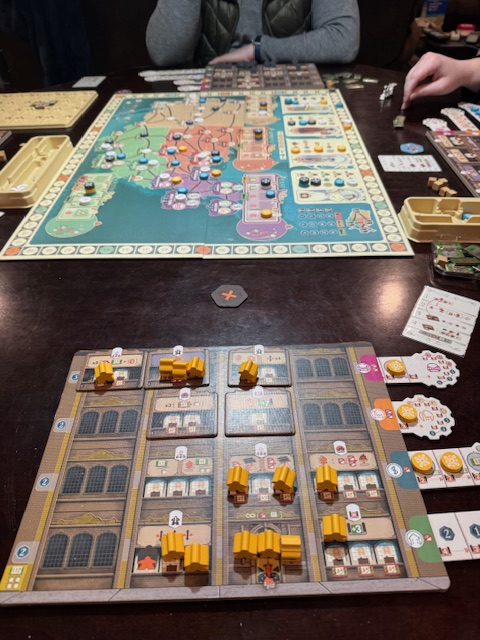 I can’t say I liked Carnegie, but it is highly rated. I would like to play it again to see if I like it better. Kathleen and I talked about it on the ride to her house after the game, and we think the game felt unfinished. Some of the elements did not score enough points to be done—why include them? It seems to be the first draft of a better, more streamlined game that dropped many less essential items. The board game Grand Hotel Austria, which covers much of the same mechanics, is better, I believe.