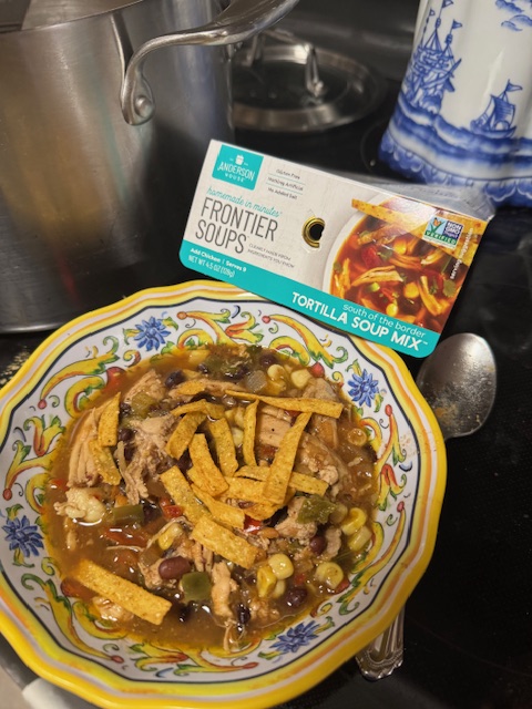 Corwin enjoyed all but one tamale and finished the flan. I sent him away with a bag of frozen beef stew and some frozen ham. I made tortilla soup from a King Arthur Flour Company package while talking to Deborah. It did not come with tortilla strips (?!). I shredded two chicken thighs after defrosting and boiling them. I added the water from the boiling and half a box of chicken broth to the mix. The chicken went in with 1/2 of a container of medium salsa. I let this cook in a boil and simmer for a while. I had purchased strips to add to the soup. I forgot the avocado; next time.