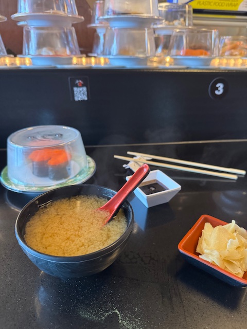 The blog for Tuesday has already been published, meaning I am at loose ends. I read the news (I am still doom-scrolling) and updated my Quicken entries. Jeff was there at 10 and started more power washing. I get out the broom and sweep the floors. I am talking to Deborah, who is free in the late morning my time. I head out to the local sushi place in the EV, Sushi Zen, and soon sit down at a track and pick a few favorites. They know me, and I have miso soup, hot tea, and a few plates. I am on my Apple at the same time, looking at travel options. None of these will work, I discover later, but it is fun to imagine going. I stay longer, eat more slowly, and only have four plates, which is a very light lunch. I talk to the waiter/cashier about travel, and the waiter’s eyes light up, and the waiter likes the idea of traveling to Europe.