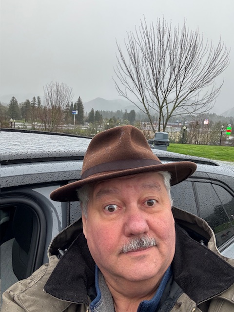 The storm became less on the other side of the 4,000-foot pass that leads to California. Four inches of snow fell near the road, the roads were clear and wet, and the winds closed Ashland ski lifts, I read later. I nearly run the EV off the road trying to take a picture of the sign to California! Oops!