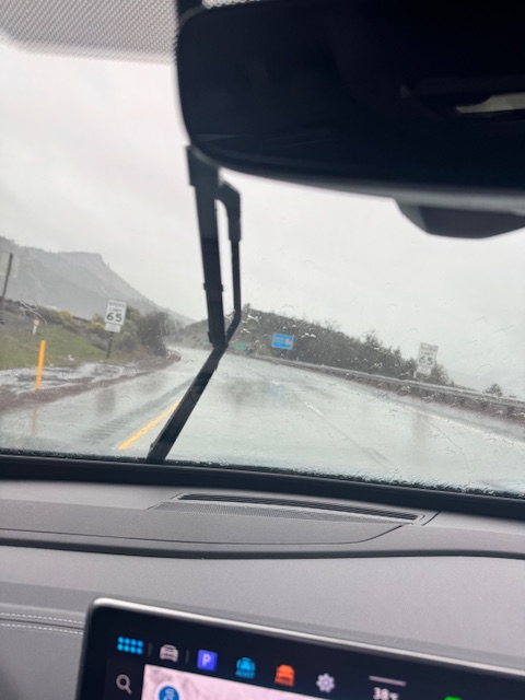 Weather is my challenge, and the snow and the rain is harsh. My wipers run at full and still have trouble clearing. Passing cars or, when I pass, throw water, blinding you for a moment. The EV slips on some water, but even at high speeds, it handles well. Unlike the Volvo, I must be careful as the steering is tight. My attention is entirely on driving once the passes approach and temperatures fall. I get down to 38F but with clear roads. I have socks as traction devices, but I do not need them. I never feel at risk, but it is an exhausting drive for four hours in the mountains.