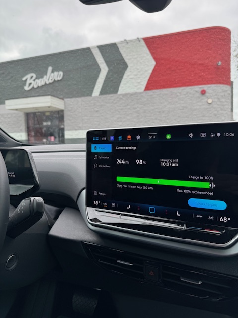 Once I am out of the city traffic, it is mostly 70+ on roads filled with other transports driving between 100 and 55. This requires considerable attention. I drive for about an hour and park, and attempt to charge at a bowling alley with a decent charger. The guy in an electric Ford Mustang (who hates the car and the $70 a day he pays in fast charging twice a day) says, “It is not that fast,” but helps me work out how to charge with yet-another-app (YAA). It takes me three tries and one password reset, but I spend an hour charging to 100%. Walmarts, bowling places, and grocery stores are my leading providers of electrical charges for Air VW the Gray.