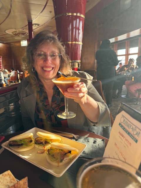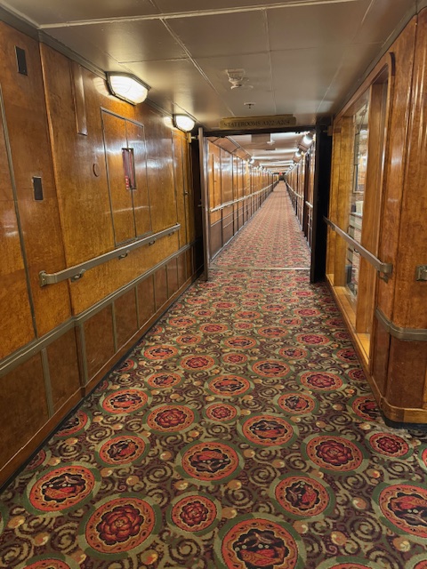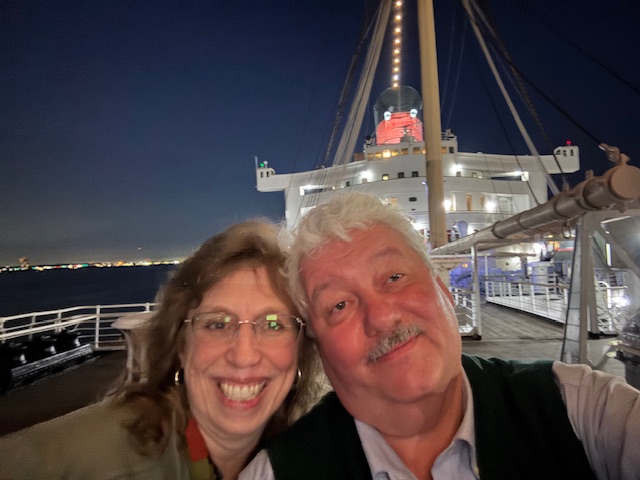 Before this, Deborah was done with her sessions and turned down a dinner with a vendor she is not using at King’s Fish House in the Art Deco part of Long Beach and instead joined me for a walk in the garage to reach Air VW the Gray to travel to the QM. It was a short pop over a bridge and then plugging in the EV. I had been there in the afternoon to see if this was something we wanted to do. I learned from the gift store and ticket seller that there was a Jazz Night, which was $0 and came with an after-night complimentary access to the QM. While not a tour, it was a chance to walk the ship. I donated $10 each to the ship’s restoration and got the tickets.