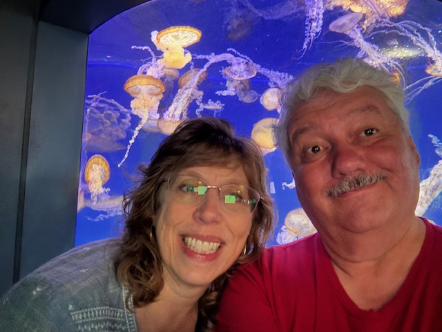 We left the aquarium happy with our day. We then walked around Rainbow Harbor to Parker’s Lighthouse Restaurant. There, we had drinks and happy hour food. We split a burger made on garlic cheese bread and a crunchy roll—both excellent. After that, we returned to the hotel; my knees and feet hurt. I have 10,000+ step days of walking, with 15,000+ on a few).