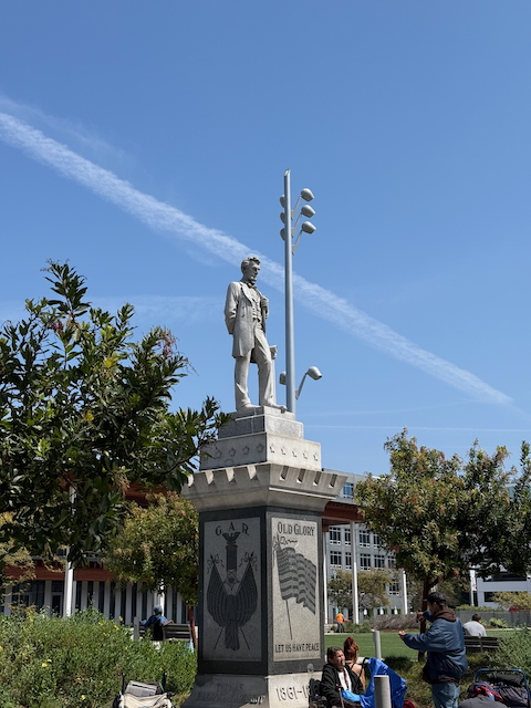 We walked back towards the shops. I was surprised to see a G.A.R. statue in the Billy Jean Public Library park. The Grand Army of the Republic (G.A.R.) was the joint North and South troops of the Civil War. They had encampments for years, combining both sides, enjoying camping, and meeting every five years or so. The last meeting was in 1949. The statue was of President Lincoln looking down and smiling. President Lincoln was the last President to lead troops in battle, yes, he even did that as president. Lincoln agreed with the Union General’s good treatment of the surrendered troops at the war’s end and was, from what I read, remembered with affection by the G.A.R. It is likely that after the ACW (American Civil War), many former army folks headed to California to make their fortune (or not). So the G.A.R. was here in Long Beach and put up the statue.