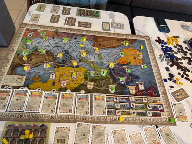 Next, after a break at our room after walking back, we returned downstairs and found a large table to play the board game Concordia I had brought in Air VW the Gray. This is an efficiency race with deck building and resource management elements with simple turns. However, the strategy and the sequencing are complicated. Deborah started to get the game about 1/2 through, and she nearly caught me, but I managed to get some more colonists out just before she ended the game (gaining 7 points). I felt I was running to keep ahead once she got the game. Deborha said she liked the game but needs a few more plays.
