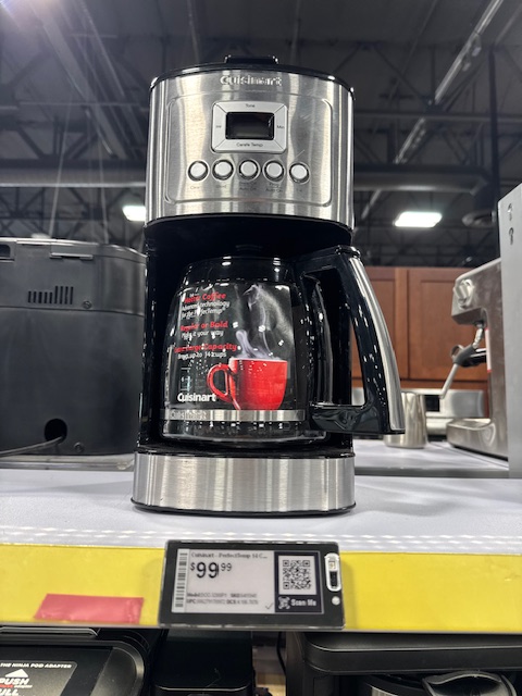 Next was Best Buy with my $100 gift card received for buying The Machine and other appliances in my pocket. The choice for a coffee maker ran high. I did not look at the $3,000+ machines that would fit the new Willy Wonka movie! I found a plain one that did ground coffee (not espresso or using pods or built-in frother) for $99.99. I carried it up to the desk and gave the gift card back. The cashier all but rolled his eyes. Yes, there was one cent left.