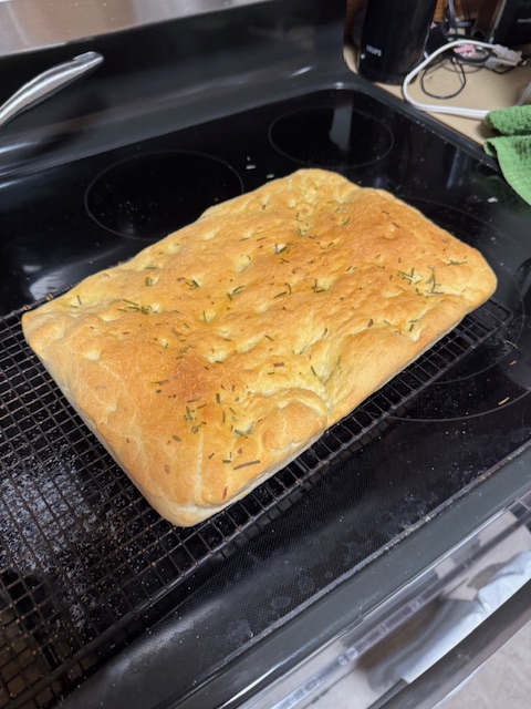 Focaccia bread was tried again. I followed the recipe for using the bread machine and saw that the new bread flour was already half used up. I loaded the machine with the ingredients with some trepidation and started the machine. It dances! The dough is stiff, and the machine moves. I had spilled some water running tests on the new coffee maker (bravely set next to the bread machine), and the bread machine was dancing on the slippery counter. A towel placed under the machine prevents the dancing. No doomed focaccia bread this time!