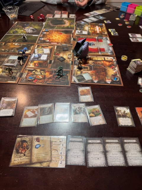 This was a new, recently purchased scenario. Though the game is older, it is still being supported, and an excellent app runs it for you. I had the original manual version and junked it, keeping the figures and rooms for use in playing the role-playing game (RPG) Call of Cthulhu. While still clunky, and I like the RPG better, Richard and James make this fun. Also, the newer scenarios are better assembled and more immersive. This was a haunted house and Mythos combined, which is a favorite story of mine. I found it quite immersive. I went insane but did not become a crazed killer. When James took the sacrificial dagger from me, Richard (his character still sane) and I (my character was insane but collecting six items to win) ran from James, and soon the Mythos creatures took out James. Richard and I finished in time and won (James technically lost as he did not sacrifice my character). It was fun, and I was out by noon.