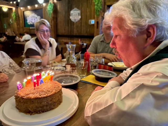 Dinner was chaotic, as our waiter was the only waiter on Thursday night. There were multiple large groups, including ours. The food was OK, but not as good as it once was (or my memory, like many, seems better than it was in the past). But the venue worked for a birthday party, and we all enjoyed the time. Deborah arranged and then lit the candles, and a familiar song was sung. I managed not to spit on the cake.