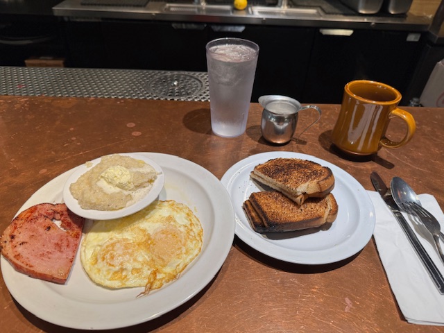 The train reached Pioneer Square in Portland without issue, and then we stopped. A train was broken before us, and it would be fifteen minutes or more to wait. I decided to walk. I walk the green/orange line and wonder why I never take this train. But I walked and soon found a place still serving lunch or breakfast with their specialty being grits: Mumbo Gumbo PDX. I got a seat at the dinner’s bar and noticed the place full of New Orleans Cafe Du Monde chicory coffee cans; I liked it immediately. I got coffee and their small breakfast with buttered grits. This is two eggs, ham, toast, and grits. Perfect. I had toast with peanut butter and coffee for breakfast; lunch could be light.