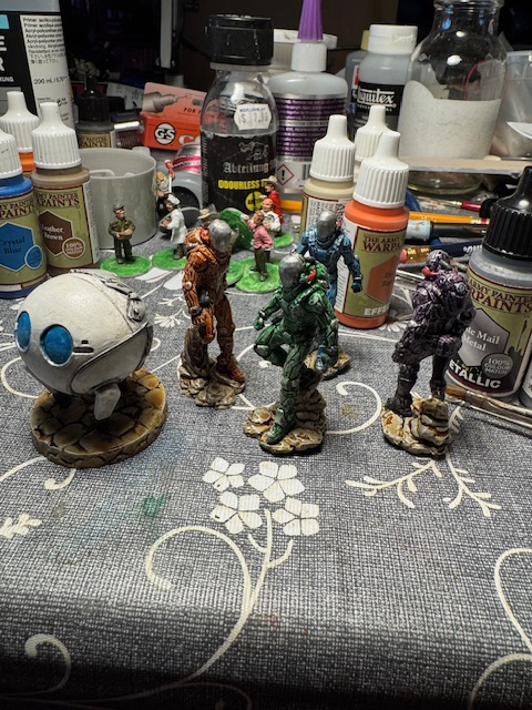 After the blog was published, I returned to pieces from the board game Unsettled in the shape of four crew members and a robot named Luna. I had painted them with acrylics and then sealed the pieces with a gloss spray. I let that dry overnight. I then got out my oil paints and a small brush. I mixed a solvent with the pure black and brushed it onto the figures to fill the cracks and lines to create a 3D effect by appealing like shadows. I had used Speed Paints that do the same thing, but not with black. Now the figures’ details really popped, and the robot, painted primarily white, looked more worn, but the lines were more pronounced, again looking more realistic. Previously, I would use ink, Dark Shade, directly on the acrylics, but often this would fade and settle by gravity, and not where I wanted it. Worse, it could not be wiped off like the oil over the shielding coat. The only recourse was to repaint the area. I must have painted some figures three times!