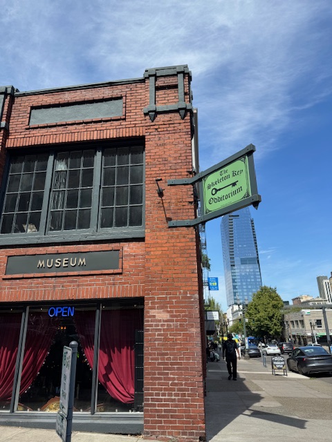 I took pictures of the Monets and was happy to walk back to the MAX with my insides deciding it wanted attention. But the Skeleton Key Odditorium was on the way back, and I paid admission to what was a tourist trap or a celebration of Goth (I saw a note to that effect in the place). It was interesting and spooky. Some things were jump scares, and I avoided them as I do really jump at them and did not want a ‘clean-up’ issue with my colon and tummy. It was like a gruesome antique store with some things for sale. A few items got my attention, like the haunted box and the blood jewelry (mixing blood with resin). Possible stories there for me, or descriptions of items in Dungeons and Dragons. Worth the visit and the $15, but not a likely return for the paid part. Photos were allowed.