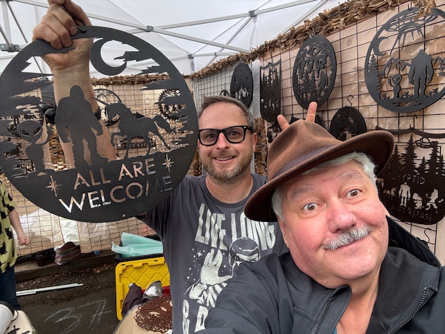 My afternoon game fell in. This was with a new gamer, who I suspect was less interested. Instead, I took Air VW the Gray to McMinnville’s UFO Festival. I had not been since the first one opened after the pandemic (with Susie trying out the travel wheelchair we used on planes and NYC later–it needed a pillow, we learned there). Navigation took me over the mountains instead of the highways, and it was a wild ride on curves in the hills in the passes. I read 1200+ feet for Champoeg. The EV got a 1% charge on the downside of Chapoeg!