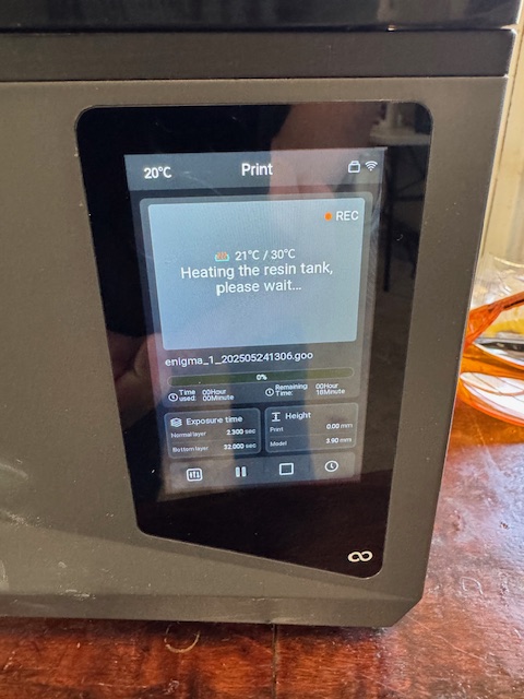 With the blog done, Mom Wild’s next postcard in the mail, and showered, shaved, and dressed, I returned to 3D printing. I took the failed print, reloaded the STL file, spun it, and supported it. I then downloaded this to a USB stick and carried it to the printer. I put on a mask and gloves. I checked the resin, which seemed OK, and started the print. There was no pause to heat the tank, it was cold at 18°C. F**k. The heater is not on! I abandon the print. I return to the printing software and rebuild the print this time with three smaller prints without support or anything. This should pool in the tank and fail if that problem persists. It is only eighteen minutes to print.