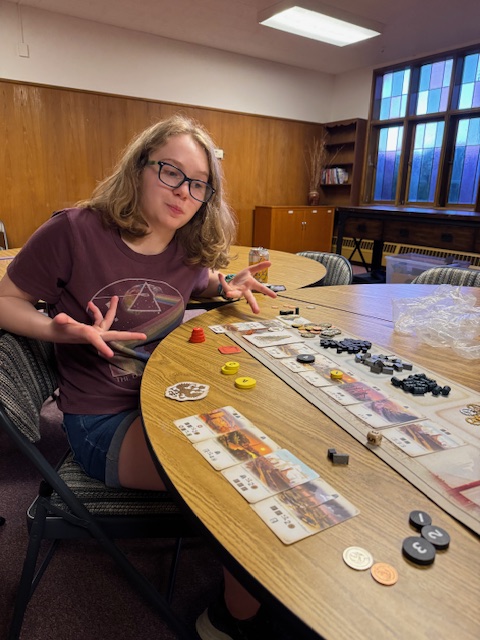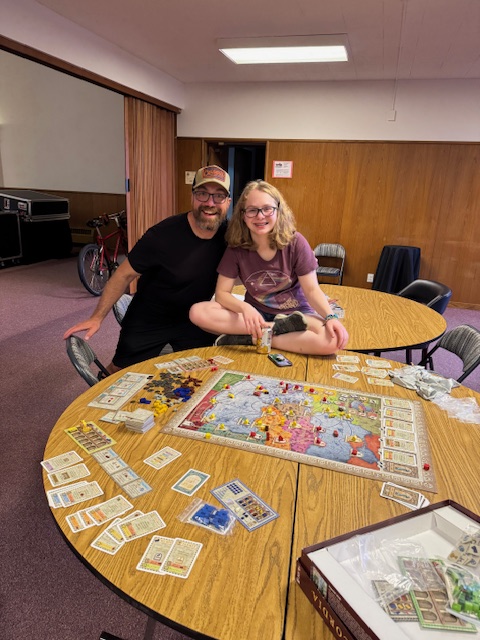 Back to playing games at First United Methodist Church near the fountain in Beaverton during choir practice. It was just Z and me for this game, and Z picked a small map for the board game, Concordia. This one is from Salsa, and we had to adjust it as we don’t play with the salt commodity (I don’t find it adds much and often distracts). We play fast and furious, as this is a favorite, and we both know how to play. We include the Forum in the game, and I collect a lucky set of choices that lets me grab personality cards faster. Z claimed that a few mistakes caused a loss of points at the end, but I was running fast to keep up the whole time, and my winning score, over 50 points, was from grabbing the Farmer and Weaver personality cards. I paid high for the Farmer, and then my Forum ability let me get Weaver cheap (turning my Senator into an optional Console card). We looked over The Age of Steam for a future game, and played only a round of Furnace (the base game).