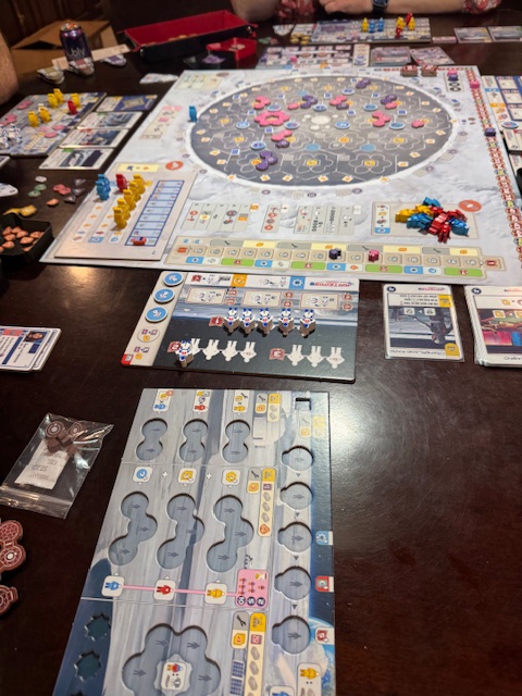 It was now hours later, and I had a game at 6 at Richard’s house. I got a sandwich, just a grilled cheese, while I ran the notebook now. I packed up, paid my bill, and headed to Richards. Laura and Richard were finishing a game of Shackleton Base: A Journey to the Moon. The board game was the choice for today: a new game, available with some upgrades from the publisher. It lasts about two hours and was a pleasure to learn and play. I scored last with Laura, thirty points ahead of me and Richard lapping me. It plays fast and turns are not complex, but the strategy is difficult–my favorite type of game. At the moment, it sold out, but I am not in a rush.