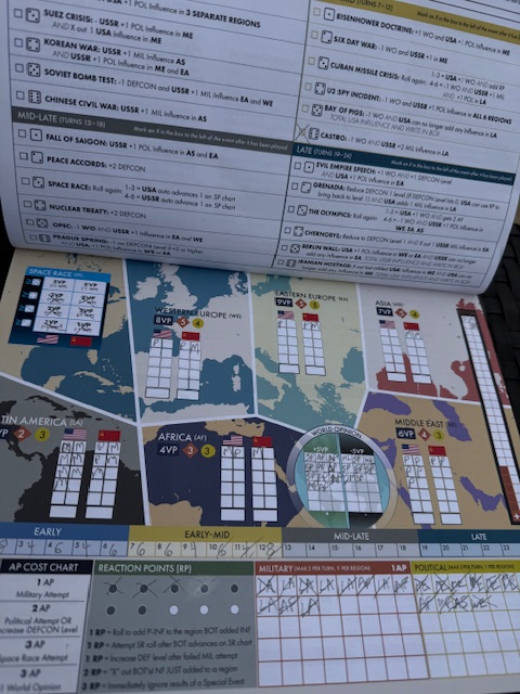 The USSR (CCCP) was represented by a die roll and a set of charts. I would say I got lucky often with these rolls and was able to stay just ahead of the BOT. I crushed in my first game, but I think I got both lucky and undercharged for the World Opinion purchases.