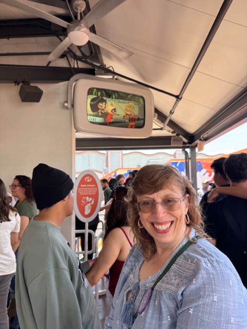 This park, California Adventure, across from the Original Disneyland in Anaheim, is a more easy-going park and has a fun vibe. We rose at 5:45ish (with Deborah awake earlier as she is still running partially on East Coast time), and managed to get to Starbucks to get a small item before heading out at 7:15 on the first bus. I had made coffee in the room for us. The shuttle got us to Disney, and we headed into the park.