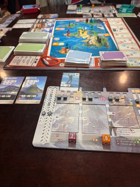 I drove the fifteen minutes to cross to Richard’s area. We were just three of us and played the newly released board game Peaks (about $89 for the deluxe version). This was an enjoyable game with a neat, partially cooperative mechanism representing climbing mountains. For three players plus a teach for me, we played it all in 90 days. The final scoring was less complex than other games we have played. Richard was surprised that Lauren won (I came in last). The game has you play one of three actions: Rest (and Move), Prepare, and Climb. As I mentioned earlier, Climb allows others to join you (for a small discount to yourself), and acquiring resources never feels like a race (though it can often be challenging); it’s a fast, friendly, and fun game. I may buy this one! I love mountain climbing stories.