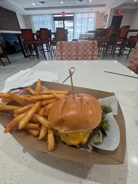 I was thirty minutes later on the clock before I reached the hotel. Everyone smiled and was sympathetic. A shuttle for Thursday, food, and a room were provided. I covered the cost of a double gin and tonic that went well with their excellent, though not the best I have had, cheeseburger.