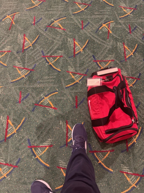 The rest of the trip consists of the usual waiting and charging devices, and then on planes. I’ve drained my phone’s battery. The first plane was tiny, and it was a one-hour trip to Charlotte, followed by a long walk to the next gate. I was 6 minutes before boarding when I finished the long walk (twenty minutes with a hydration stop) and walked over to buy a sandwich stuffed with sliced turkey and cheese. The plane was then delayed for fifteen minutes.