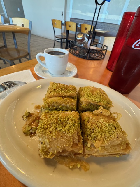 Lunch was at Gyro House (and I picked up some cash for the trip from US Bank), and I had ground lamb in a tomato sauce over pita bread with some cream sauce. I finished with coffee and baklava. I ordered too much and took them apart on the plane, so I had them before I arrived in Detroit.
