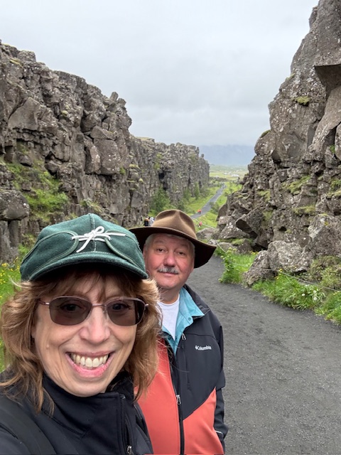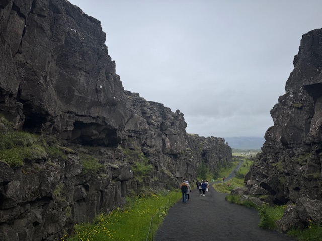 Despite the slightly blurry view, we enjoyed the hour trip to our first stop. The North American plate ends here in Iceland, and the break and the resultant valley that is the crack are lovely. Our first stop was at this break, and Deborah and I walked down one of the huge cracks and climbed up and down stairs to see a wonderful view. Our layers were working as mist and rain came and went, but we did not get cold or very wet.