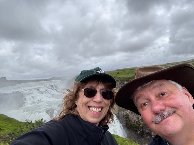 Deborah and I walked through the geyser park and enjoyed the steam and smell. The colors were bright (even in the damp gray light). We saw the one huge geyser that gives a show every five minutes and were not disappointed by the eruption! We could see inside and watch the water heat, and the surface would move and pulse. Suddenly, a huge bubble-like column of water would rise and shoot high into the sky. We were mesmerized and watched it three times. We turned our backs to walk back to the bus, and it fired off again seconds later, surprising everyone. Marvelous.